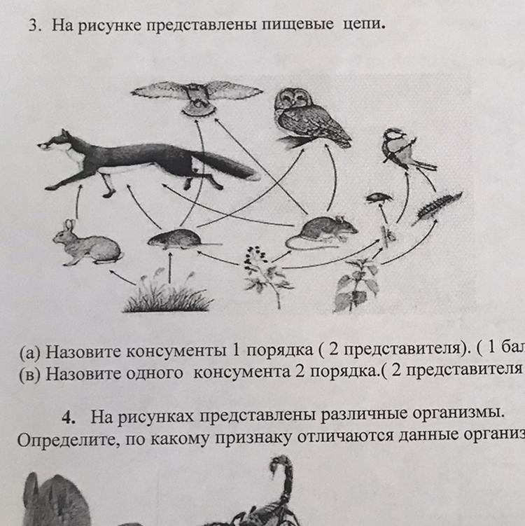 Консументы 2 порядка (хищные, питающиеся консументами 1 порядка) - лиса, сова