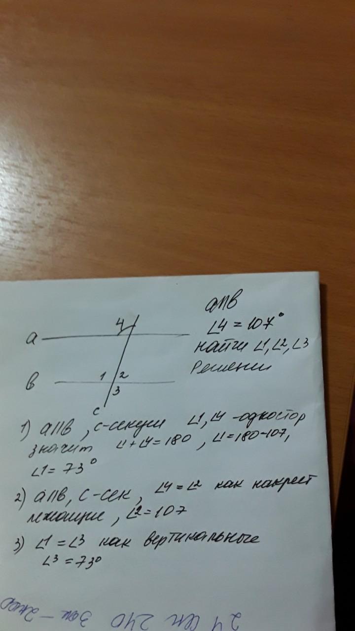 прямые а и b параллельные,угол 4 равно 107 градусов найдите угол 1 угол 2 угол 3