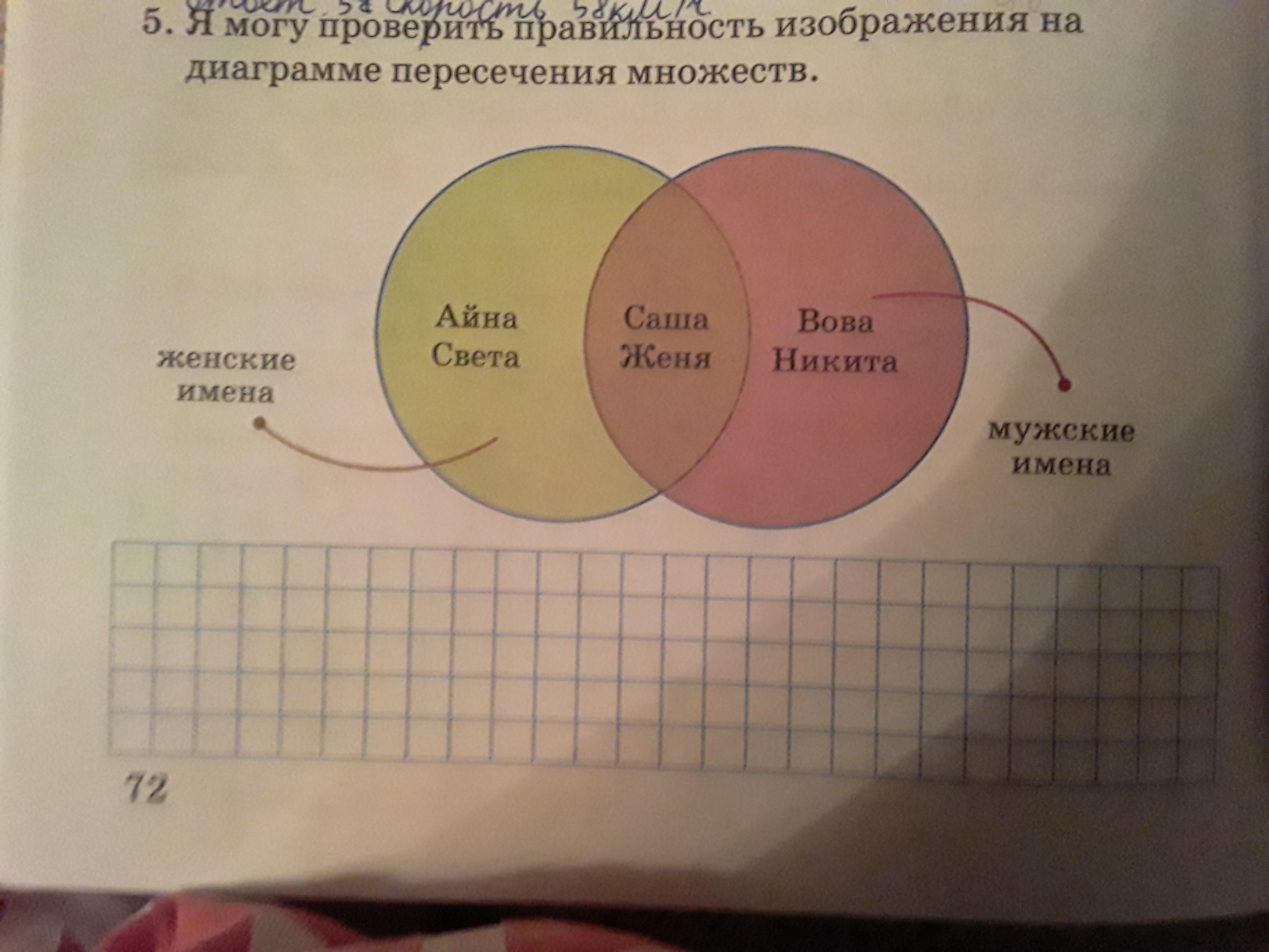 Ответ. Айна и Света, как показано на диаграмме женские имена. Вова и Никита мужские имена, а Женя и Саша подходят как девочкам, так и мальчикам.
