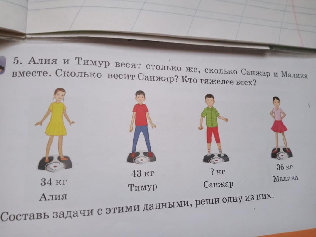 1) 34 + 43 = 77 (кг) - весят вместе Алия и Тимур. 2)77-36=41(кг)-весит Санжар Ответ:Санжар весит 41 кг. Тимур теделее всех