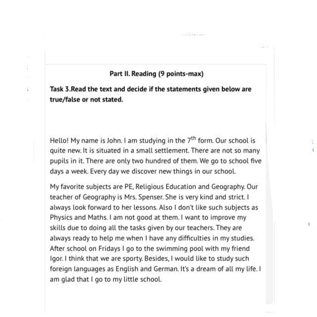 Здравствуйте! Меня зовут Джон. Я учусь в 7 классе. Наша школа совсем новая. Он расположен в небольшом поселке. В нем не так много учеников. Их всего двести. Мы ходим в школу пять дней в неделю. Каждый день мы открываем новые вещи в нашей школе. Мои любимые предметы - физкультура, религиозное образование и география. Наш преподаватель географии - миссис Спенсер. Она очень добрая и строгая. Я всегда с нетерпением жду ее уроков. Также мне не нравятся такие предметы, как физика и математика. Я не хорош в них. Я хочу улучшить свои навыки, выполняя все задания, поставленные нашими учителями. Они всегда готовы помочь мне, когда у меня возникают трудности в учебе. После пятницы после школы я хожу в бассейн с моим другом Игорем. Я думаю, что мы спортивны. Кроме того, я хотел бы изучать такие иностранные языки, как английский и немецкий. Это мечта всей моей жизни. Я рад, что я в моей маленькой школе.