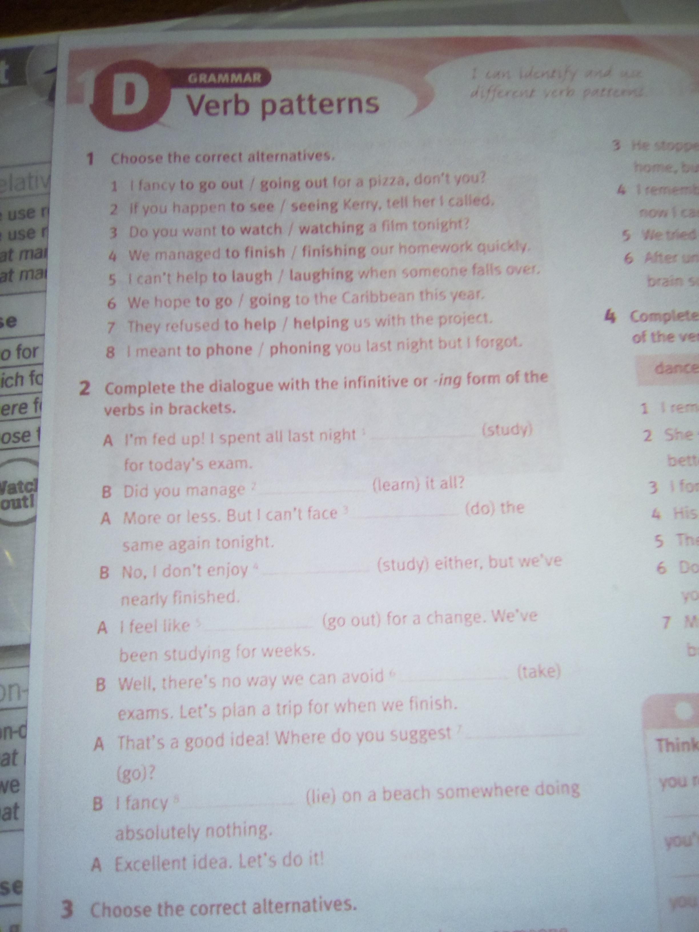 2. Studying; to learn; doing;studying;going out; taking; going; lying