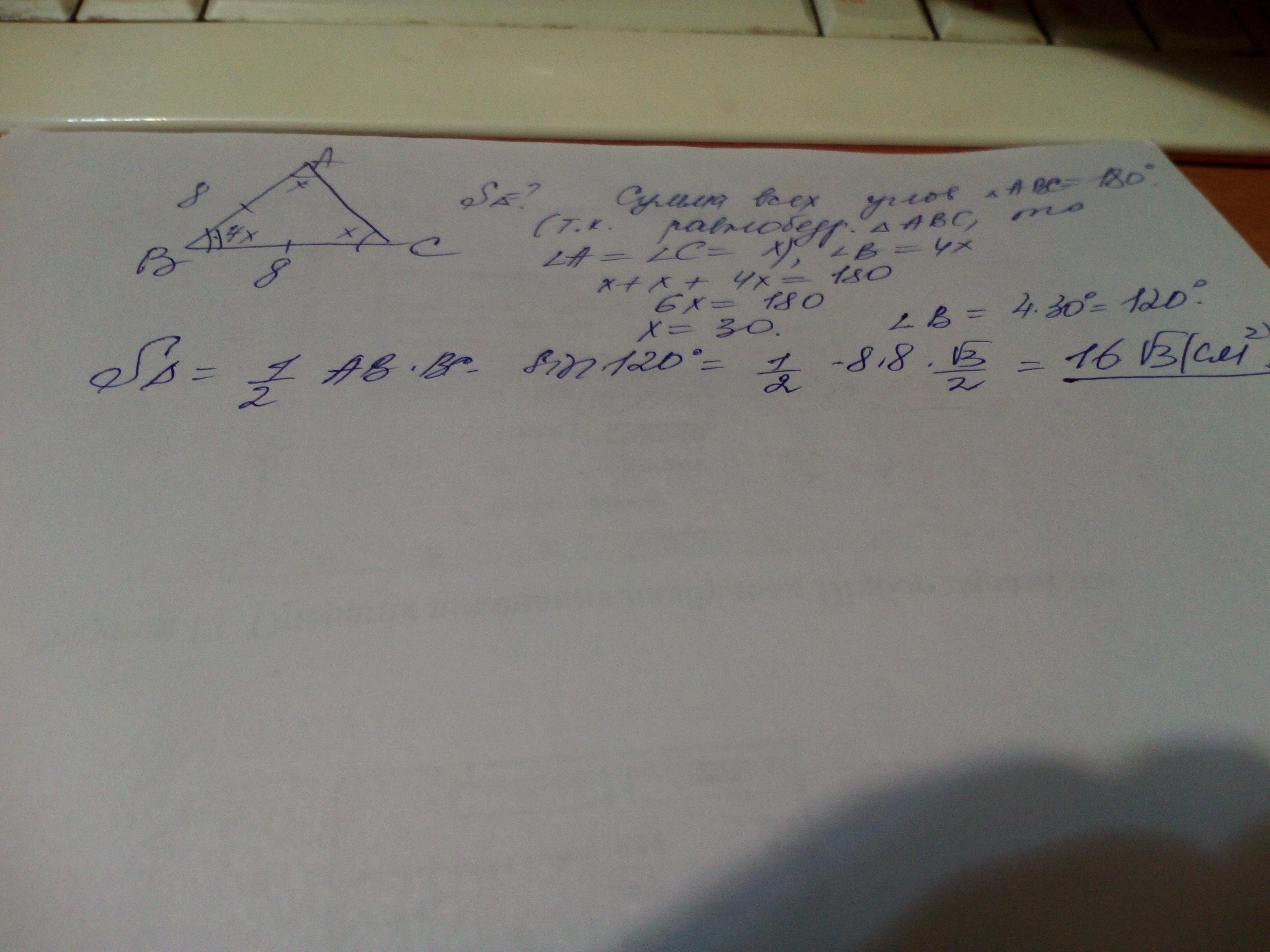 Дан равнобедренный треугольник ABC с основанием AC, у которого BC=8см. <A:<B=1:4. Найдите площадь треугольника ABC. Срочно нужно!!! Заранее СПАСИБО!!