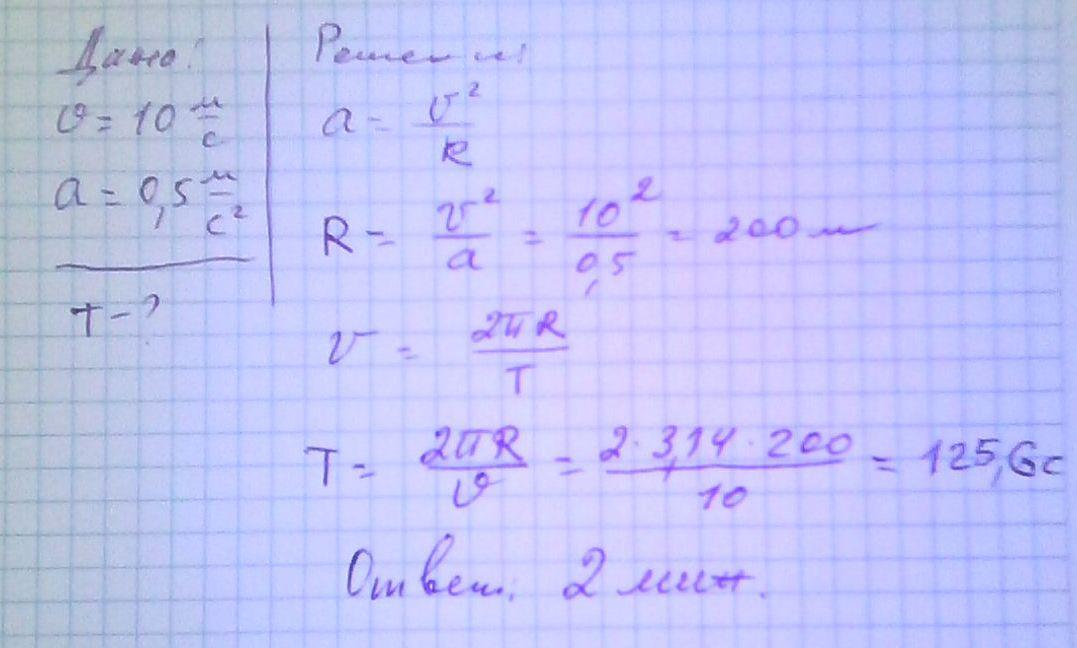 Тело равномерно движется по окружности со скоростью 10 м/с. Чему равен период обращения, если его ускорение равно 0,5 м/с²?
