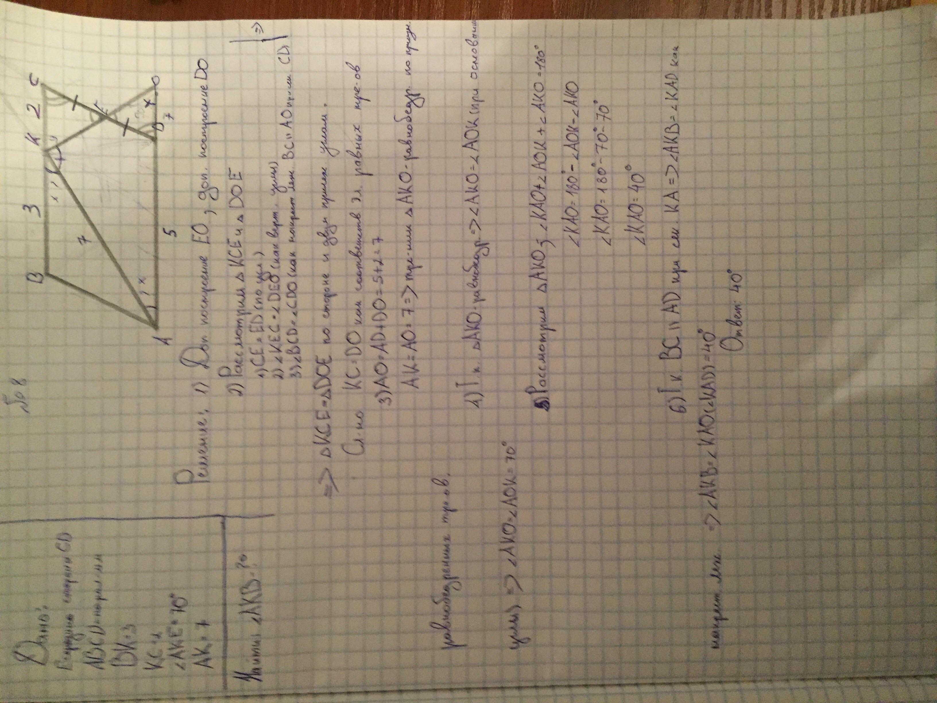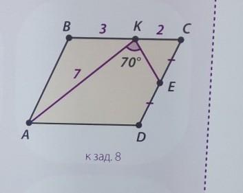 точка e-середина стороны cd параллелограмма abcd. на его стороне bc взяли точку k так, что bk=3,ck=2. известно, что угол ake=70°, ak=7. найдите угол akb