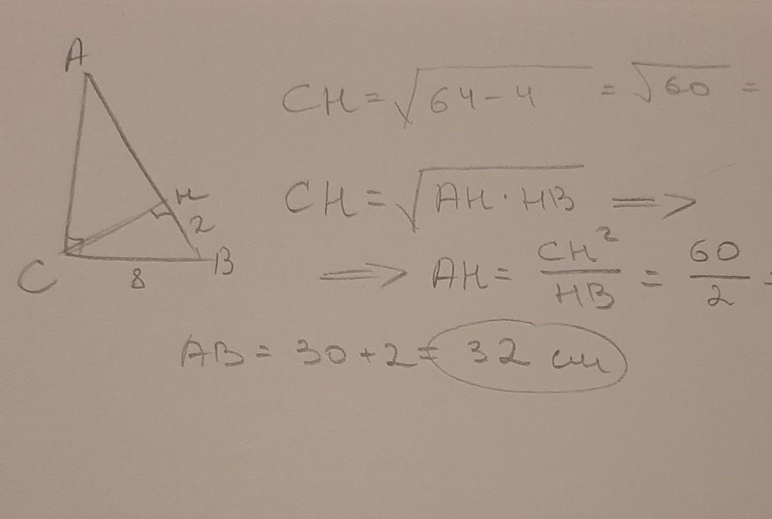 Дан прямоугольный треугольник ABC, угол C = 90 градусов, CH - высота, BC = 8 см, HB = 2 см. Найдите длину гипотенузы AB.