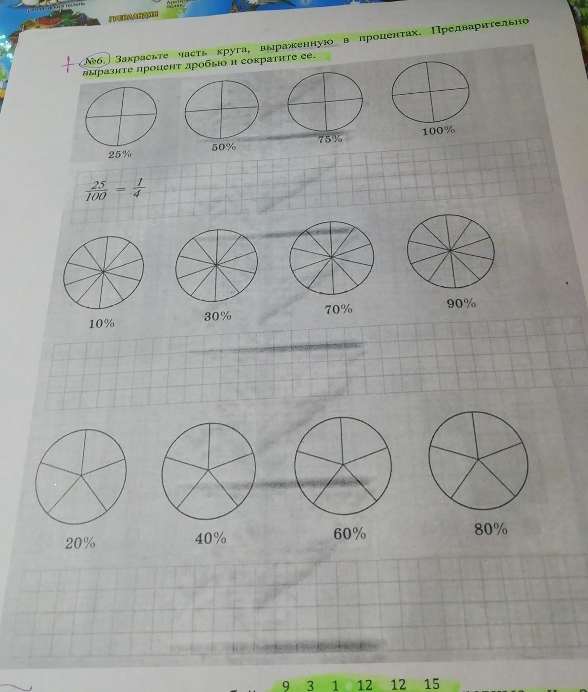 В 1 круге 1 часть, во 2 круге 2 части, в 3 груге 3 части, в 4 круге все закрасить, в 5 круге 1,в 6 круге 3 части, в 7 круге 7 частей, в 8 круге 9 частей, в 9 круге 1 часть, в 10 круге 2части, в 11 круге 3 частей и в 12 круге 4 части.