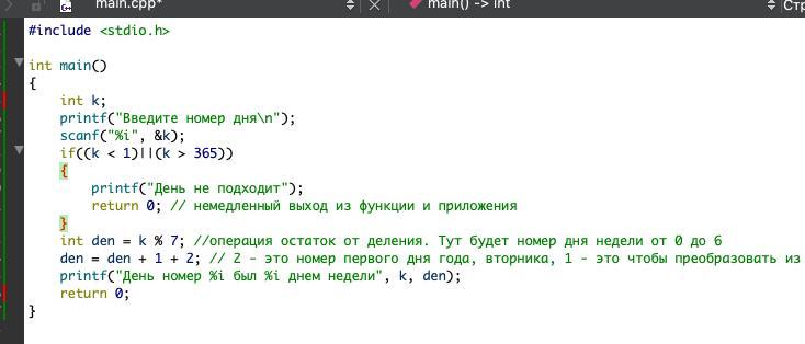 int den = k % 7; //операция остаток от деления. Тут будет номер дня недели от 0 до 6