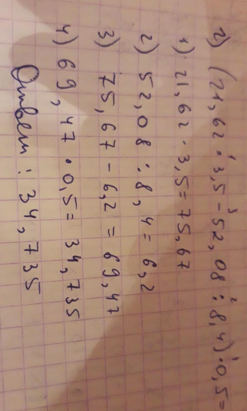 (21,62 × 3,5 - 52,08 ÷ 8,4) × 0,5 = 34,735