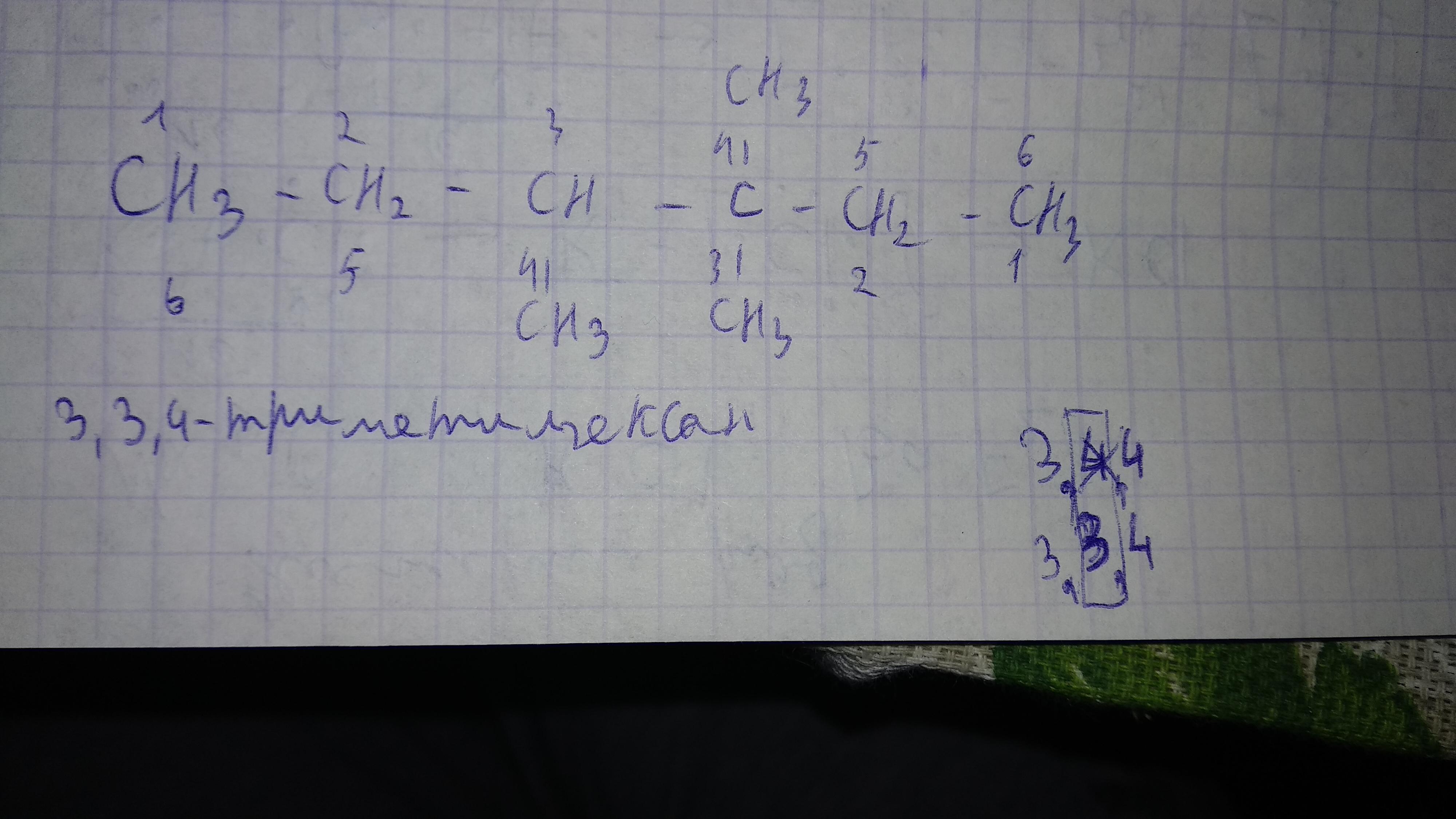 3,3,4-триметилгексан. Ещё важно выбрать правильно, с какой стороны нумеровать.