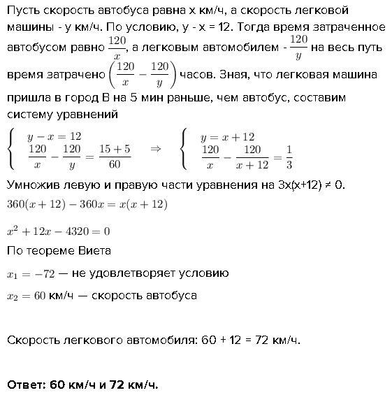 Решите задачу с помощью системы уравнений. Расстояние между городами А и В равно 120 км. Из города А в город В вышел автобус, а через 15 мин - легковая машина, скорость которой больше скорости автобуса на 12 км/ч. Легковая машина пришла в город В на 5 мин раньше, чем туда прибыл автобус. Найдите скорости автобуса и легковой машины.
