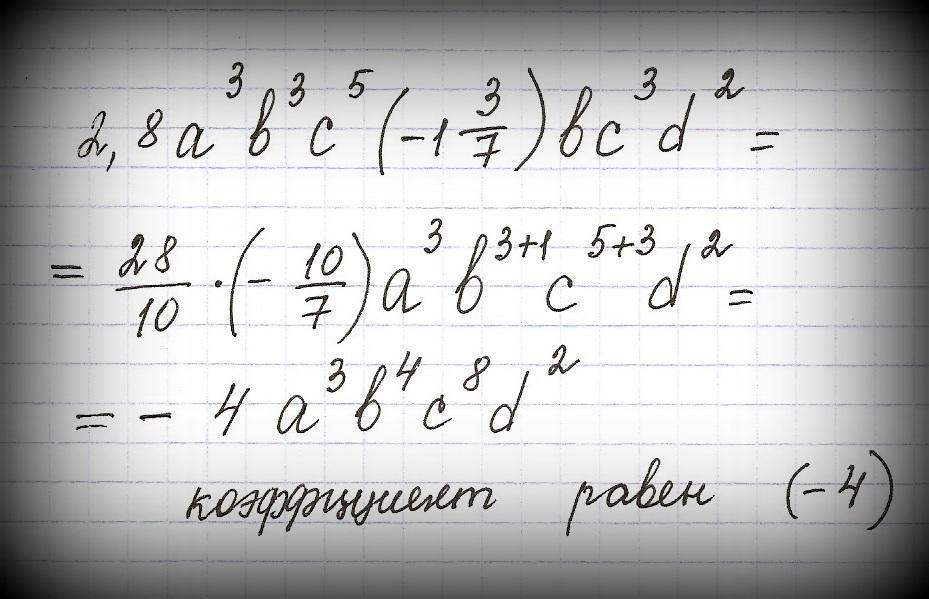 1. Приведите одночлен 2,8 a^3 b^3 c^5 (-1 3/7) bc^3 d^2 к стандартному виду и укажите его коэффициент ПОМОГИТЕ ПЖ