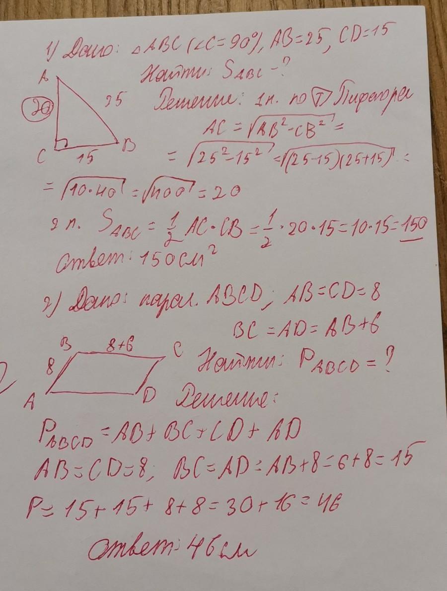 2) Длина одной стороны пароллелограмма равна 8 см , другая на 6 больше . Найти : пириметор паролеллограмма .