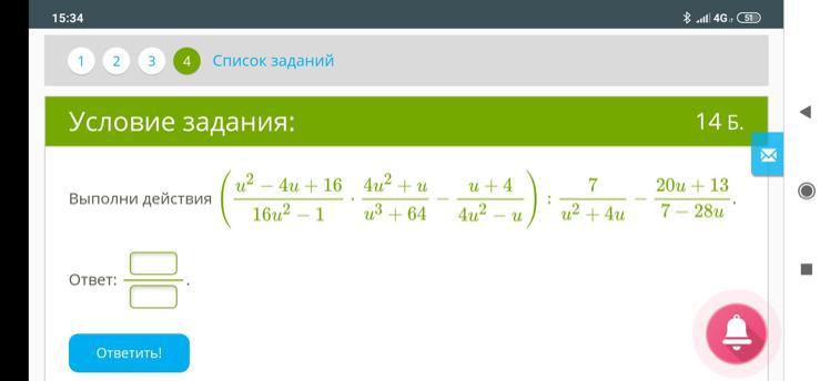 ((u²-4u+16)/(16u²-1) ·(4u²+u)/(u³+64) -(u+4)/(4u²-u)) ÷7/(u²+4u) -(20u+13)/(7-28u)=((u²-4u+16)/((4u-1)(4u+1)) ·u(4u+1)/((u+4)(u²-4u+16)) -(u+4)/(u(4u-1))) ·u(u+4)/7 -(20u+13)/(7(1-4u))=(u/((4u-1)(u+4)) -(u+4)/(u(4u-1))) ·u(u+4)/7 -(20u+13)/(7(1-4u))=(u²-(u+4)(u+4))/(u(4u-1)(u+4)) ·u(u+4)/7 -(20u+13)/(7(1-4u))=(u²-(u²+8u+16))/(7(1-4u)(4u-1)) -(20u+13)(4u-1)/(7(1-4u)(4u-1))=(8u+16-20u-13)/(7(1-4u)(4u-1))=(3-12u)/(7(1-4u)(4u-1))=3(1-4u)/(7(1-4u)(4u-1))=3/(28u-7)=3/(7(4u-1))