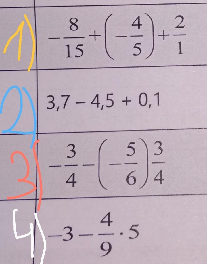 Помогите пожалуйста!!! 1) -8/15 + (-4/5) + 5целых 3/20; 2) 3,7 - 4,5 + 0,1; 3) -3/4 - (-5/6)3/4; 4) -3 - 4/9 × 5. Пожалуйста напишите подробно!!! ДАМ 50 БАЛЛОВ!!!!!!