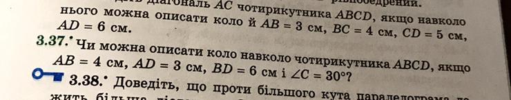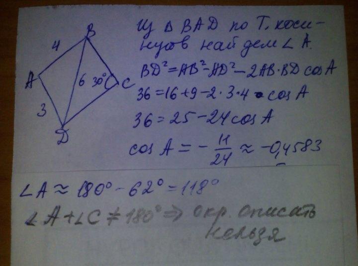 Задача по геометрии номер 3.37, перевод: «Можно ли описать окружность вокруг четыреугольника ABCD, если AB=4 AD=3 BD=6 и угол C= 30 градусов