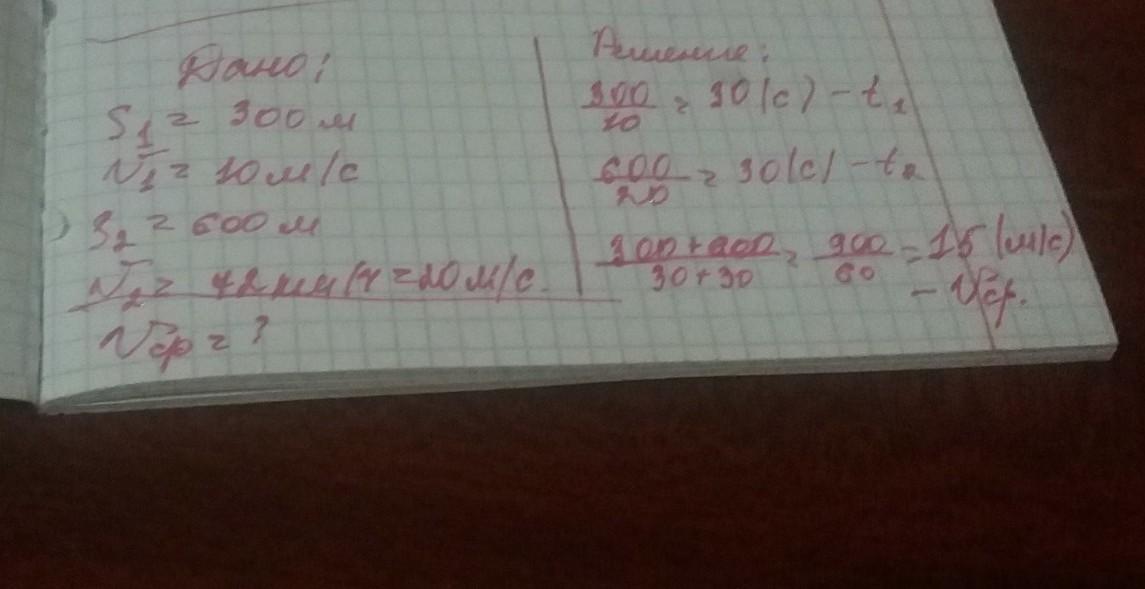 Первые 300м. Автомобиль прошел со средней скоростью 10м/с, следующие 600м. Со скоростью 72км/ч. Определите среднюю скорость движения автомобиля на всём пути.