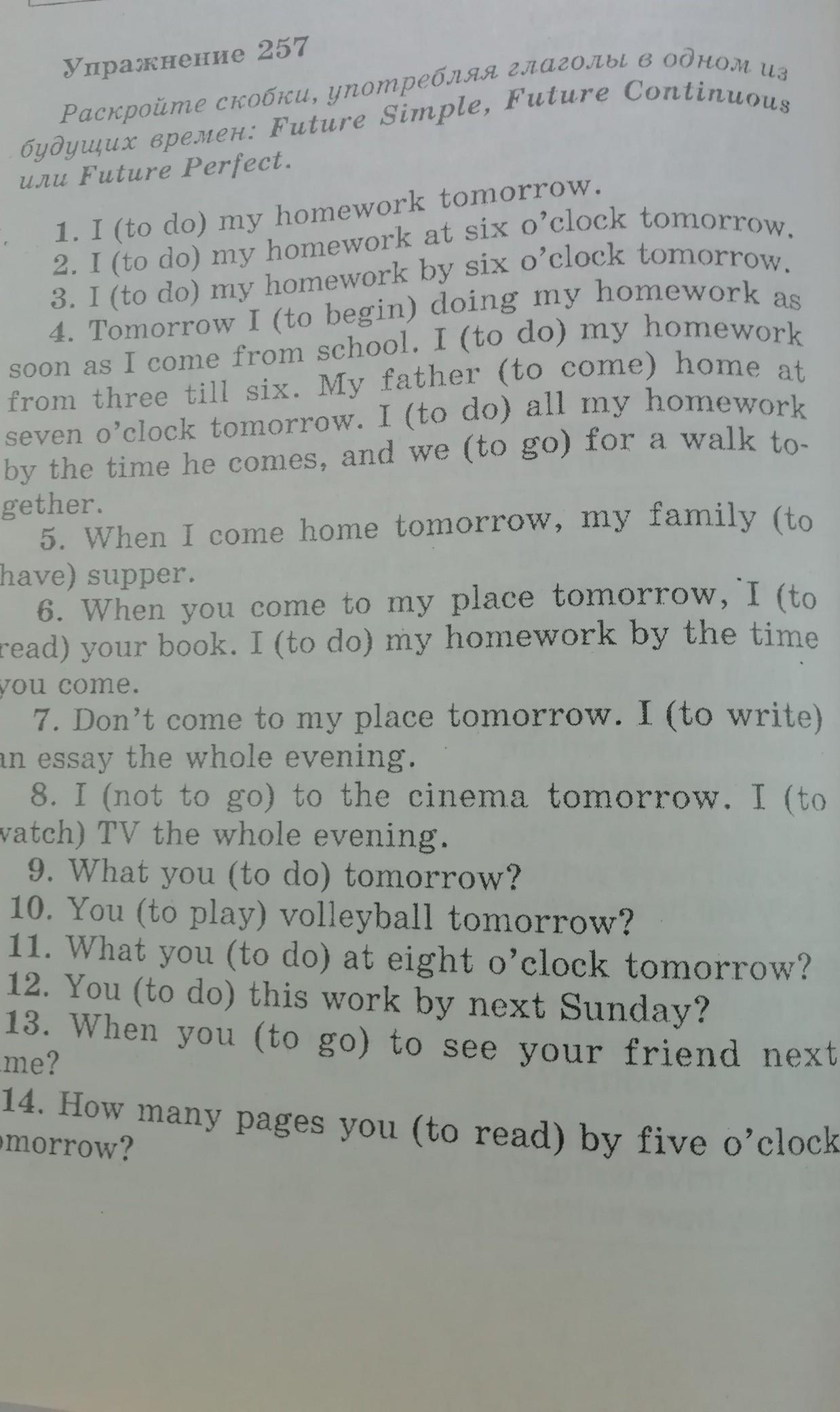Ответ:1. Will do.2. Will be doing.3 will have done. 4. Will begin 5.will have 6. Will have read. will have done 7. Will write. 8. Won't go. Will be watching.9. What will you do.10.Will you play. 11. What will you be doing .12. Will you do. 13. When will you go.14. Will you be reading