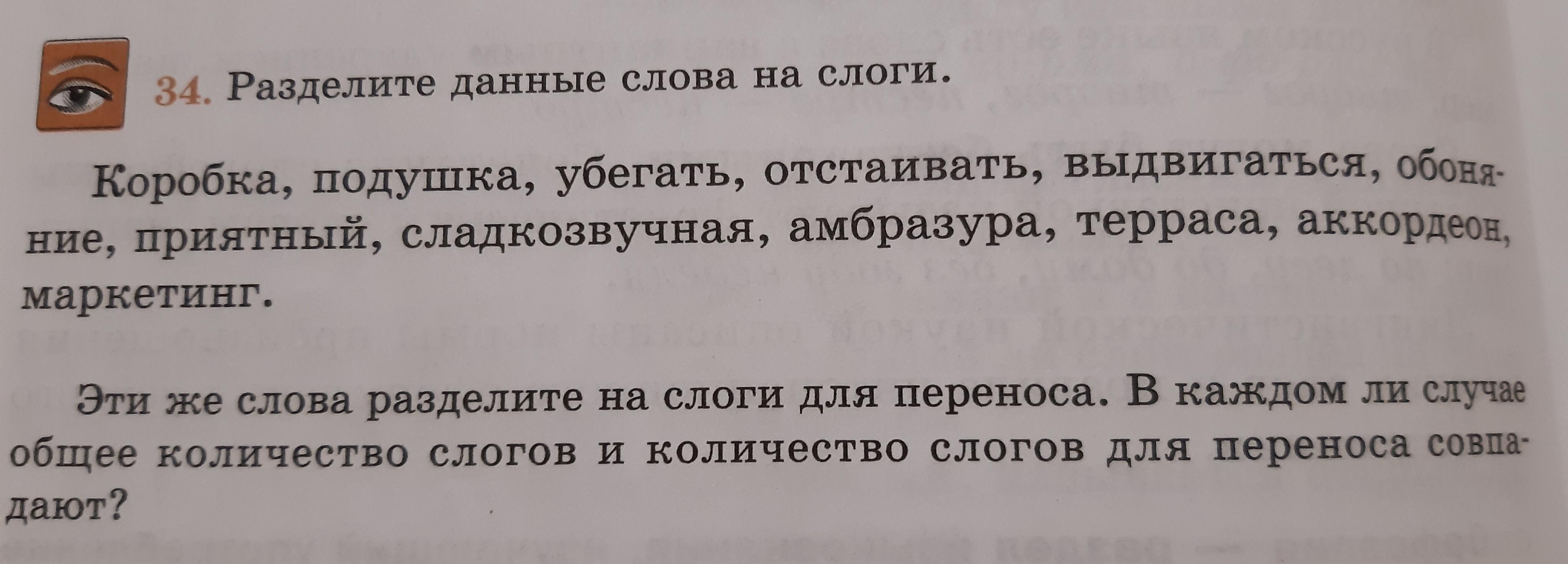 Ко-роб-ка, по-душ-ка, у-бе-гать, отс-таи-вать, выд-ви-гать-ся, обо-ня-ние, при-ят-ный, слад-коз-вуч-ная, амб-ра-зу-ра, тер-ра-са, ак-кор-де-он, мар-ке-тинг.