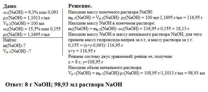 Сколько граммов NaON и какой обьем 9,3 мас% раствора NaOH(плотность раствора 1,1013 г/мл) надо взять для получения 100 мл 15,5 мас% раствора(плотностью 1,1695 г/мл) ?