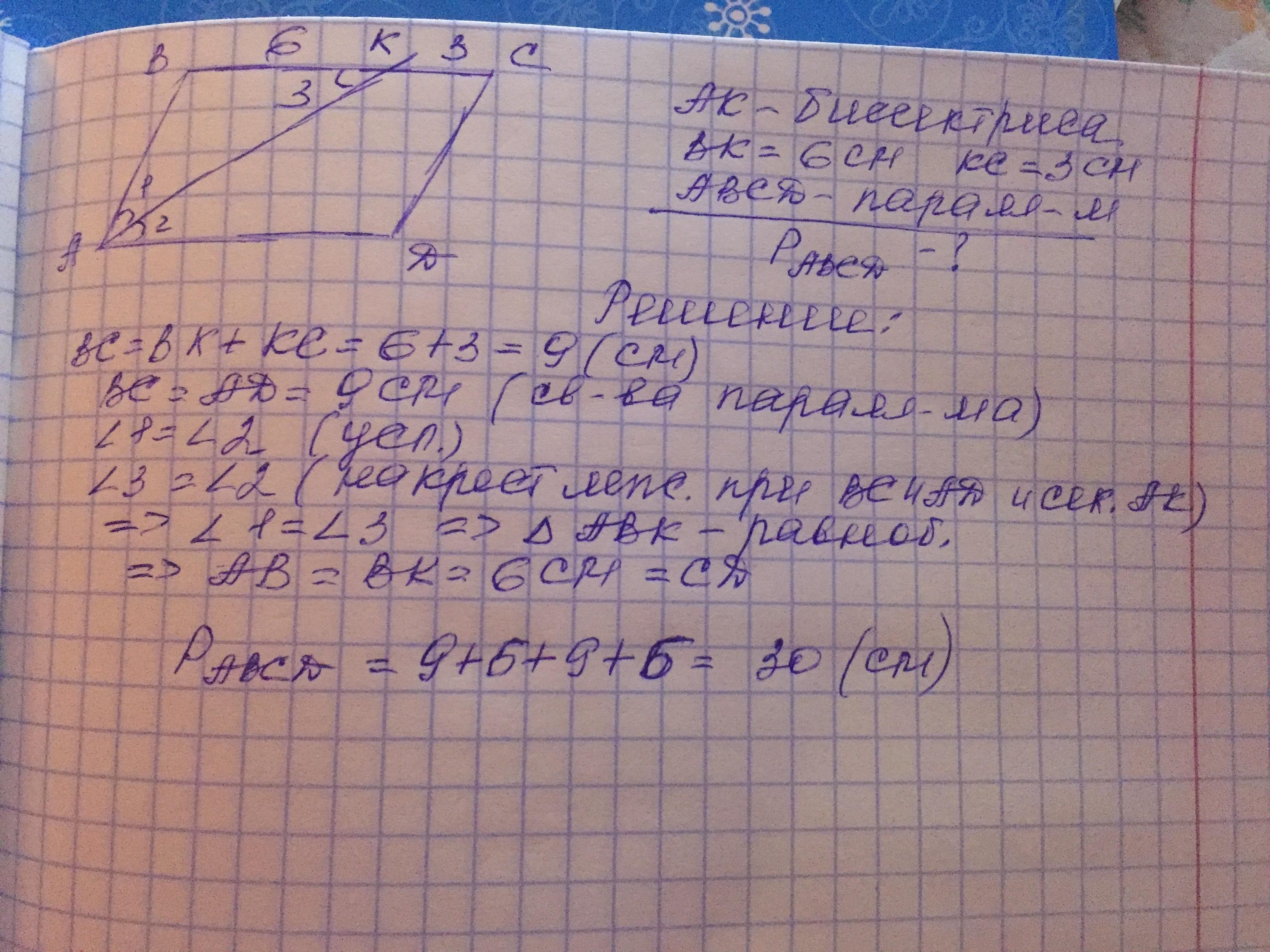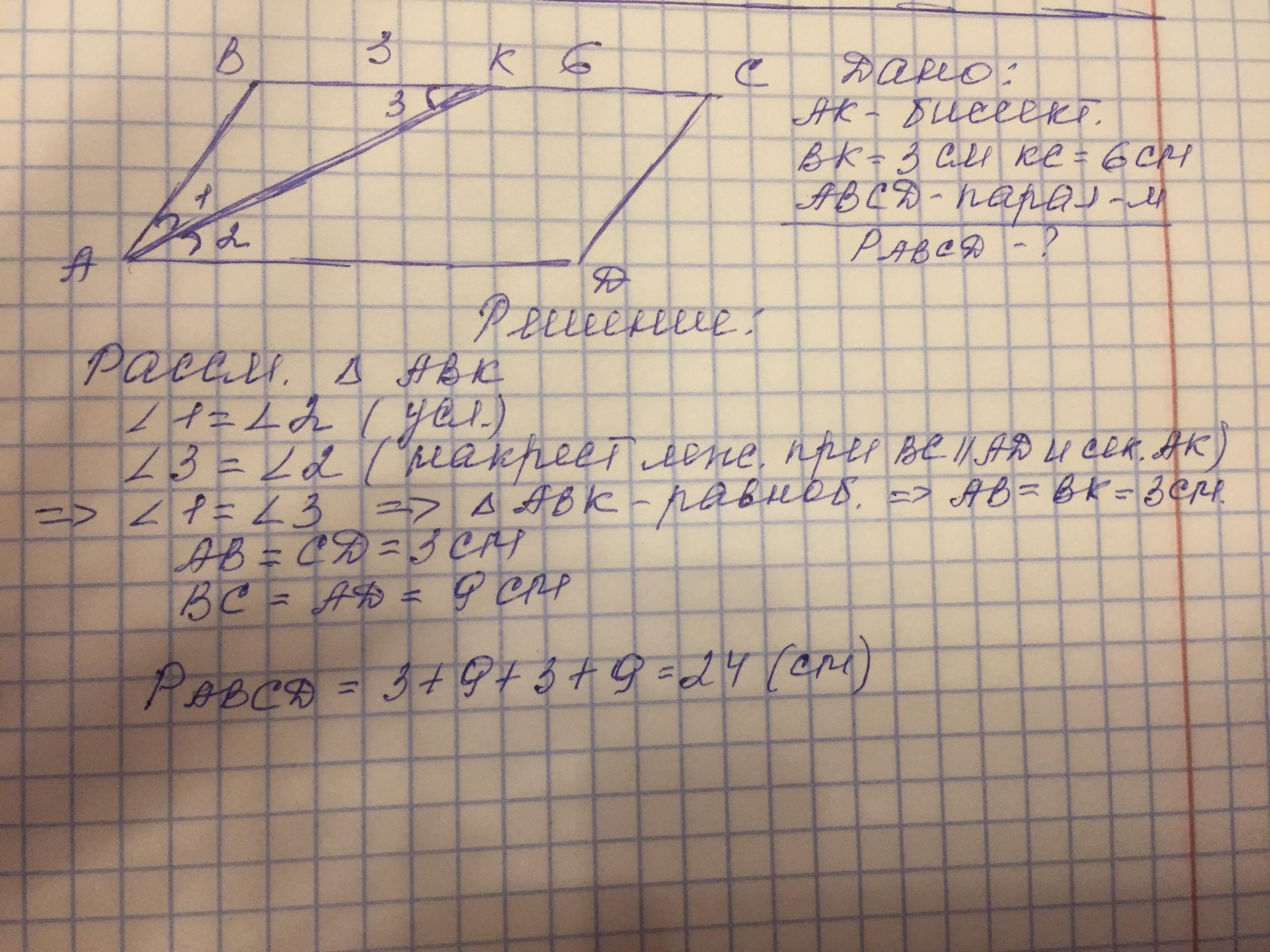 биссектриса параллелограмма делит противоположную сторону на 3 см и 6 см найти периметр параллелограмма