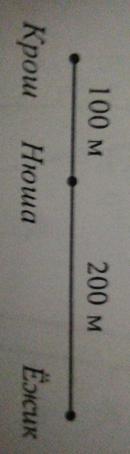 Крош, Нюша и Ёжик расположились на прямой дороге, как показано на рисунке. Крош и Ёжик побежали одновременно навстречу друг другу со скоростями 5 м/с и 7 м/с соответственно.