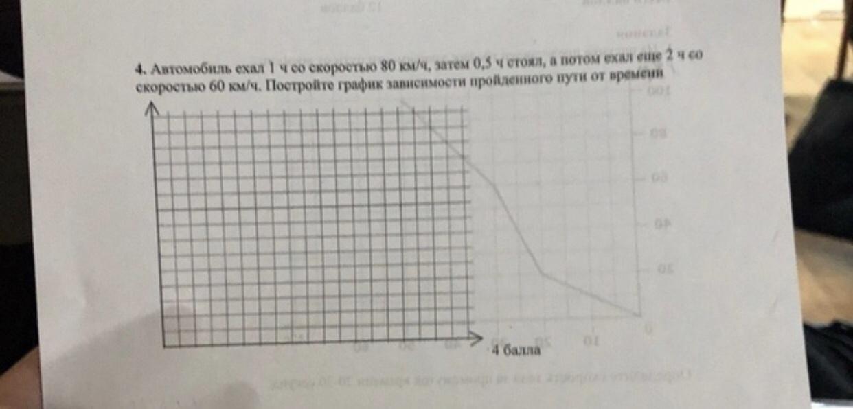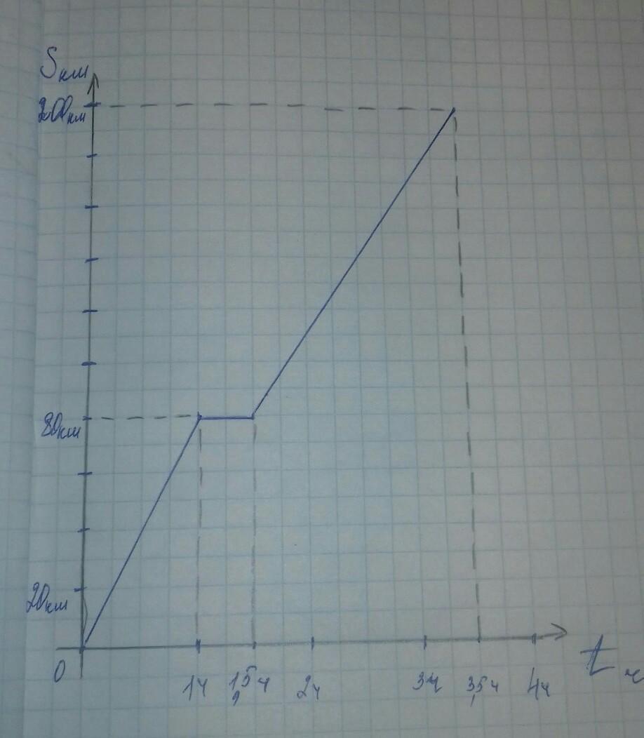 Автомобиль ехал 1 со скоростью 80км/ч, затем 0,5ч стоял,а потом ехал еще 2 ч со скоростью 60км/ч. Постройте график зависимости пройденного пути от времени