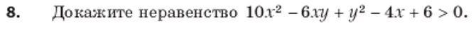 10x² - 6xy + y² - 4x + 6 = 9x² - 6xy + y² + x² - 4x + 4 + 2 = (3x - y)² + (x - 2)² + 2 > 0, так как первые скобки как минимум равны 0(квадрат любого числа больше или равен нулю), а 3 слагаемое 2 гарантирует что выражение не равно 0, а значит больше 0
