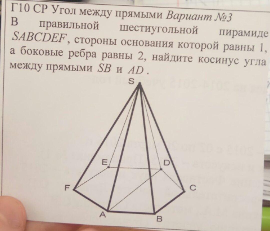 50 баллов. В правильной шестиугольной пирамиде SABCDEF стороны основания которой равны 1, а боковые ребра равны 2, найдите косинус угла между прямыми sb и ad.