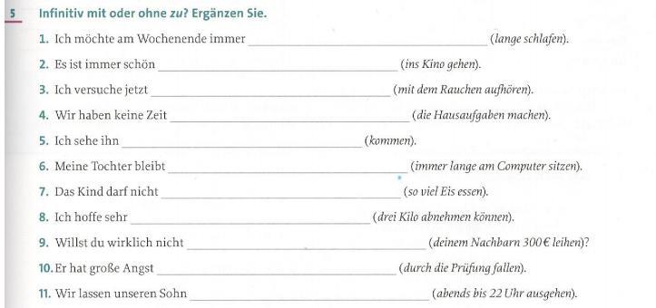 1. Ich möchte am Wochenende immer lange schlafen. (модальный глагол — без «zu“=´)