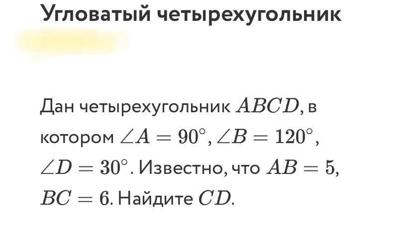 Дано: четырехугольник ABCD, ∠А=90°, ∠В=120°, ∠D=30°. АВ=5 см, ВС=6 см. Найти СD.