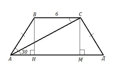 основанием угол 30°. Найдите большее основание трапеции, если меньшее основание 6 см.