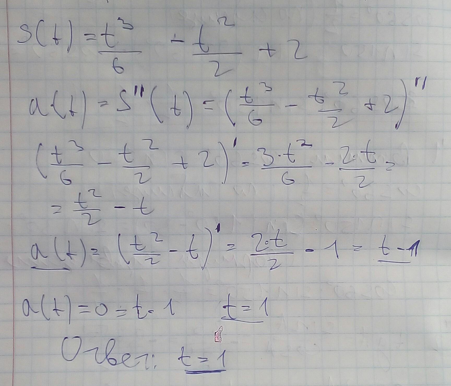 Найти момент времени t, когда её ускорение равно 0.