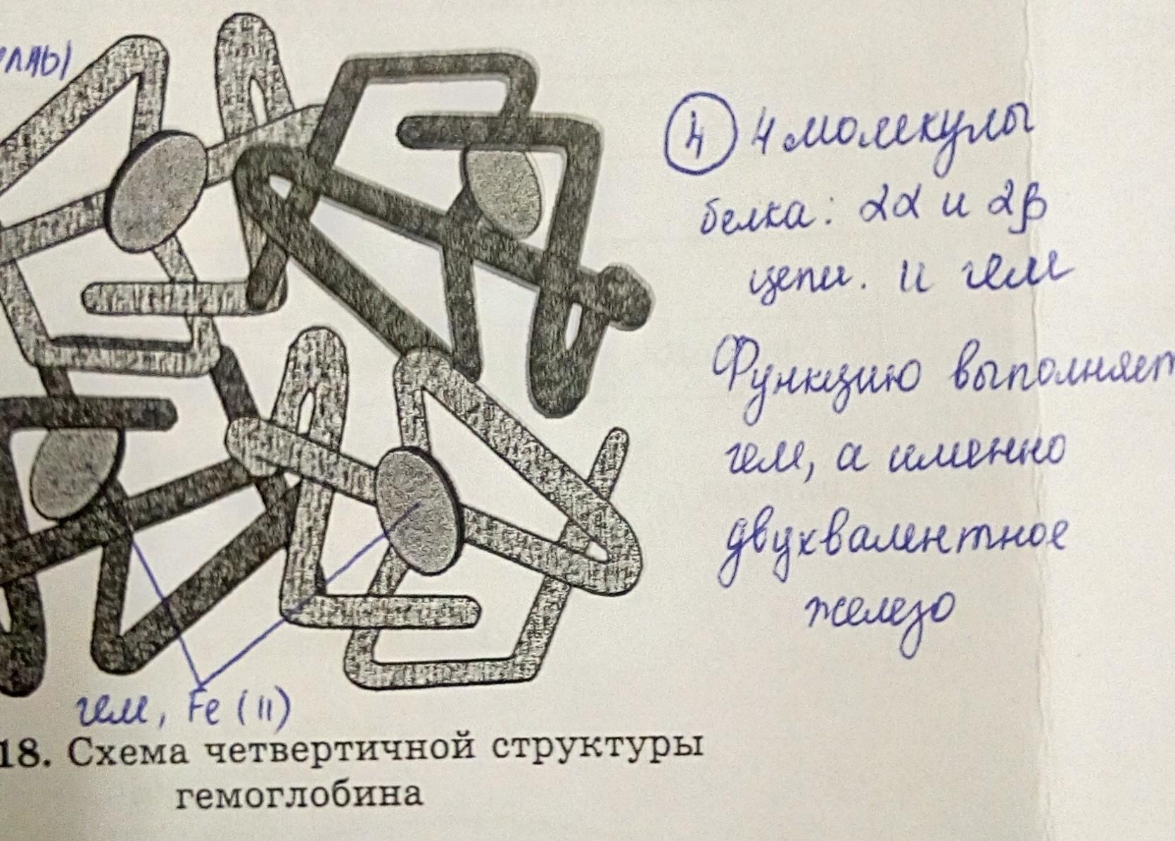 Гемоглобин состоит из белковой части (глобин) и небелковой железосодержащей части (гем). На одну молекулу глобина приходится четыре молекулы гема. При этом валентность железа не изменяется, т.е. оно остается двухвалентным.Железо, которое входит в состав гема, способно присоединять и отдавать кислород.