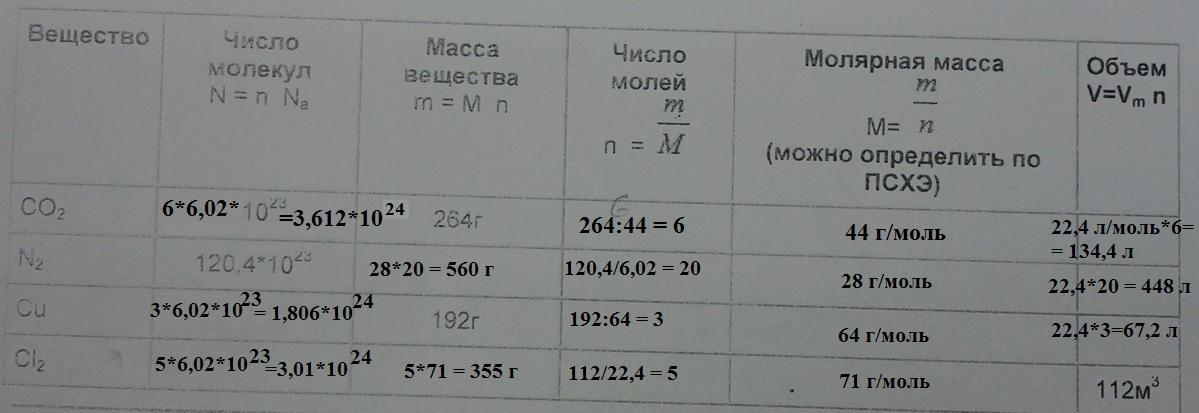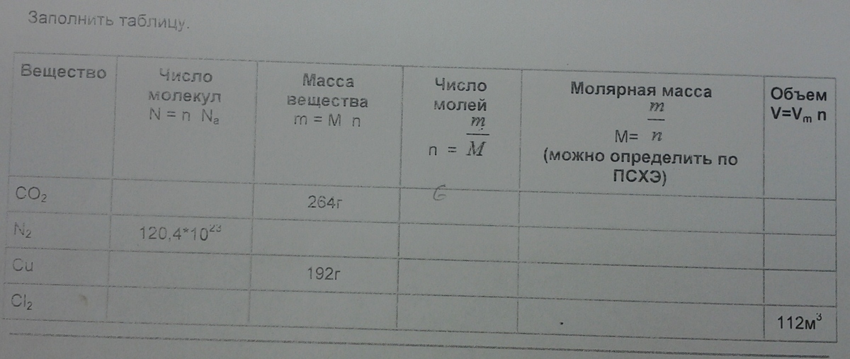 заполните таблицу: вещество, число молекул, масса вещества, число молей, молярная масса, объем