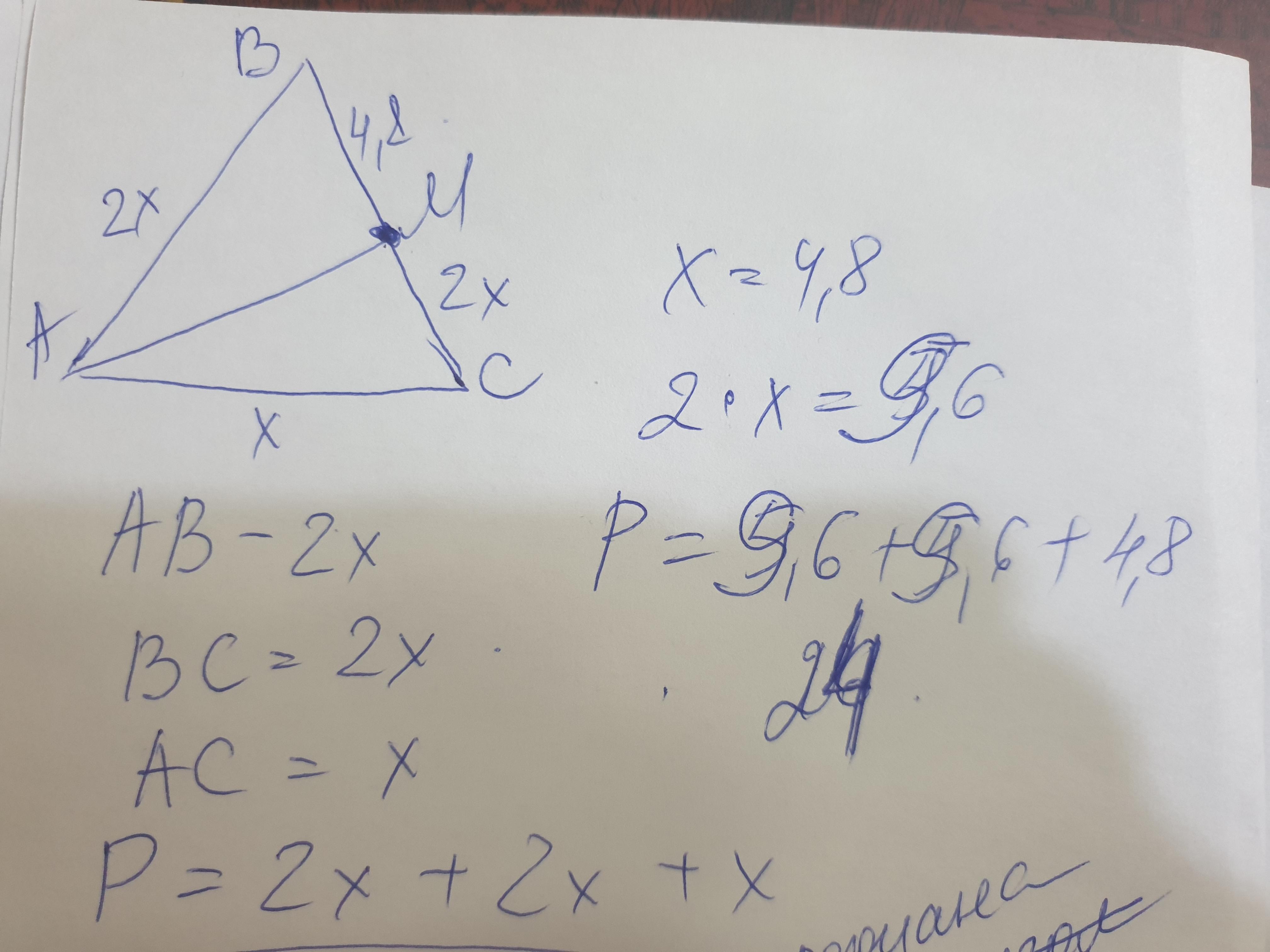 Так как известно что отрезок вм равен 4.8 тогда сторона все будет равна 4.8+4.8=9.6