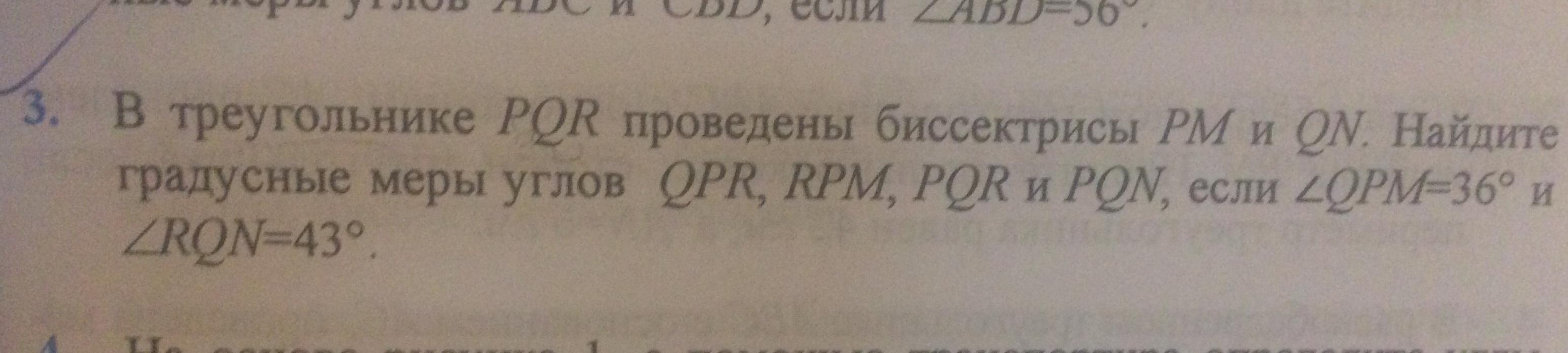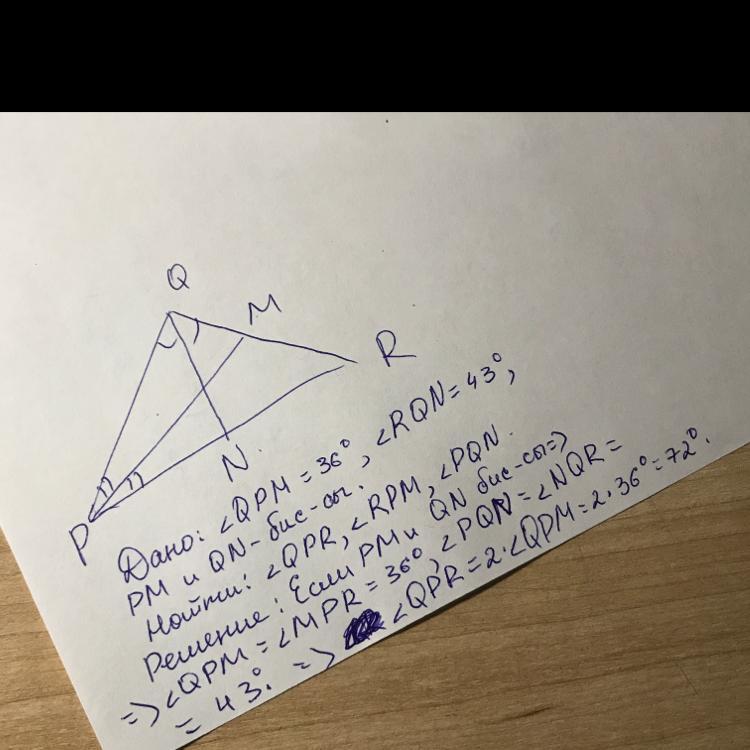 В треугольнике PQR проведены биссектрисы PMиQN .Найдите градусные меры углов QPR,RPM,и PQN, если угол QPM=36 и угол RQN=43