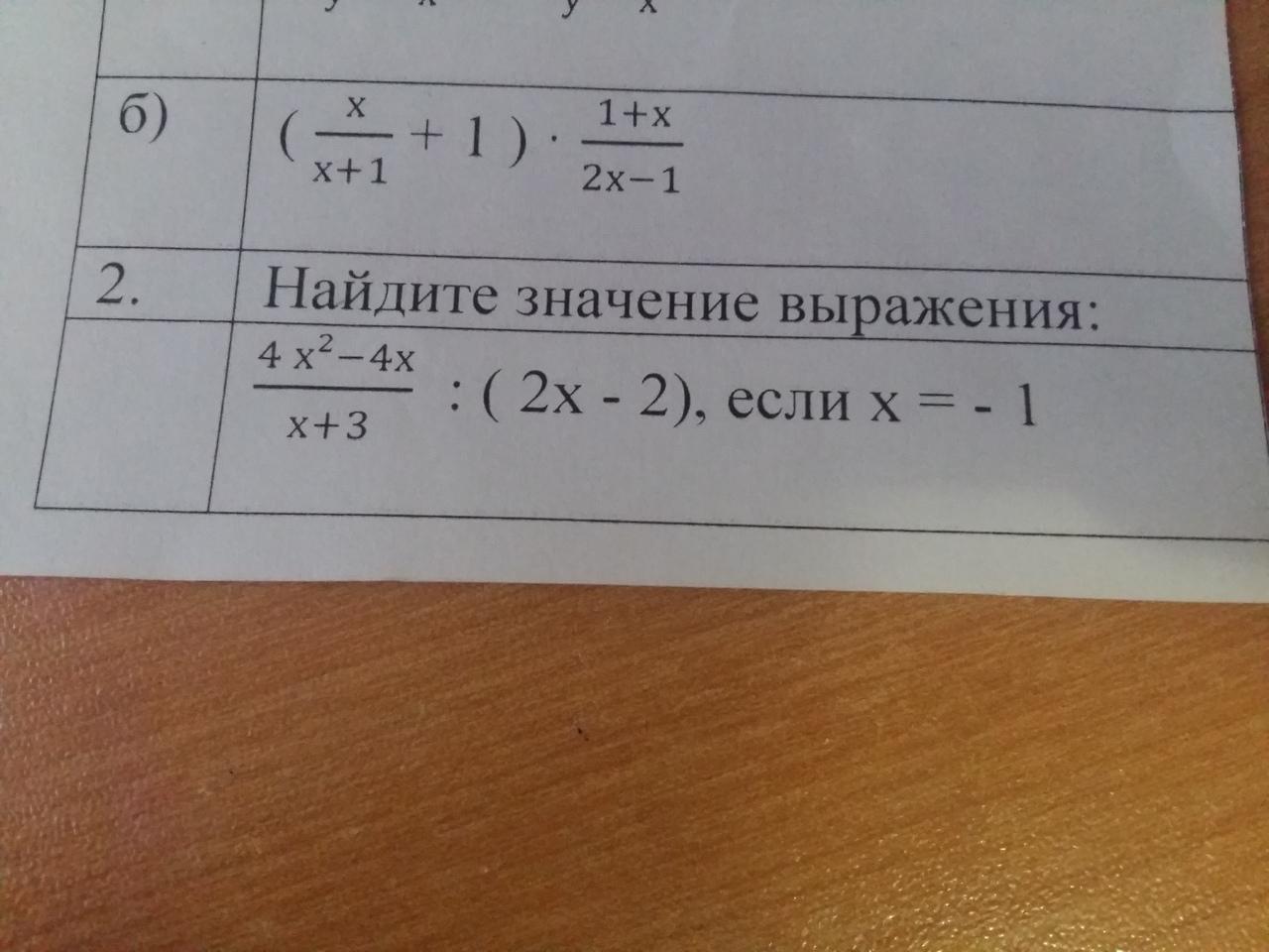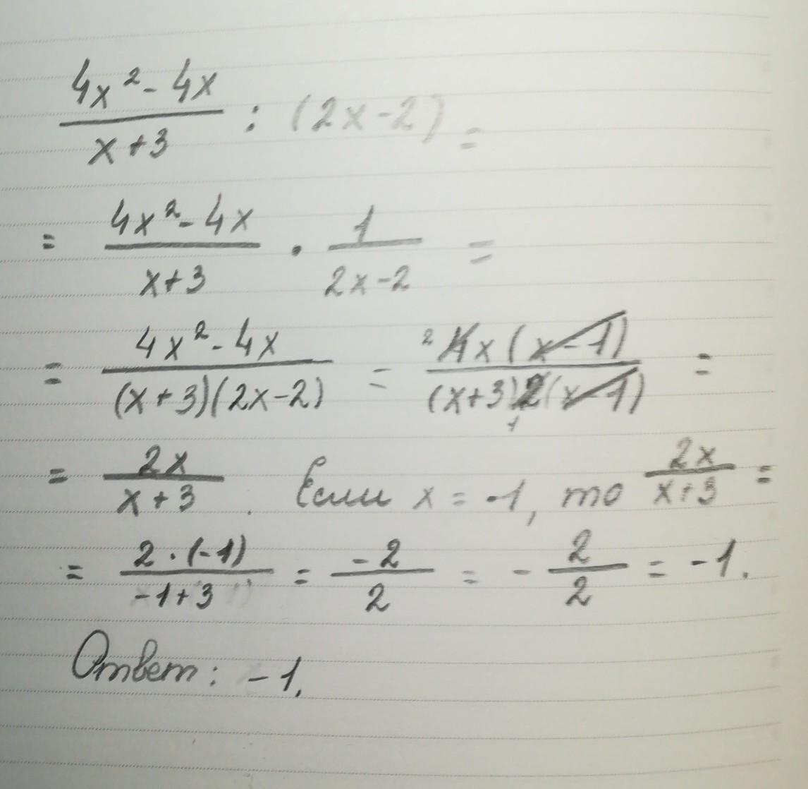 (4х^2 -4х)/(х+3) ÷(2х-2)=4х(х-1)/(х+3) •1/(2•(х-1))=2х/(х+3)=2•(-1)/(-1+3)=-2/2=-1