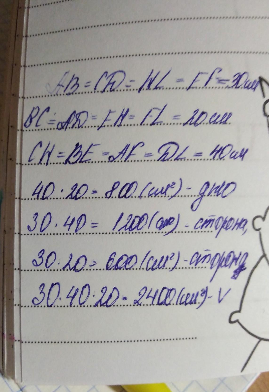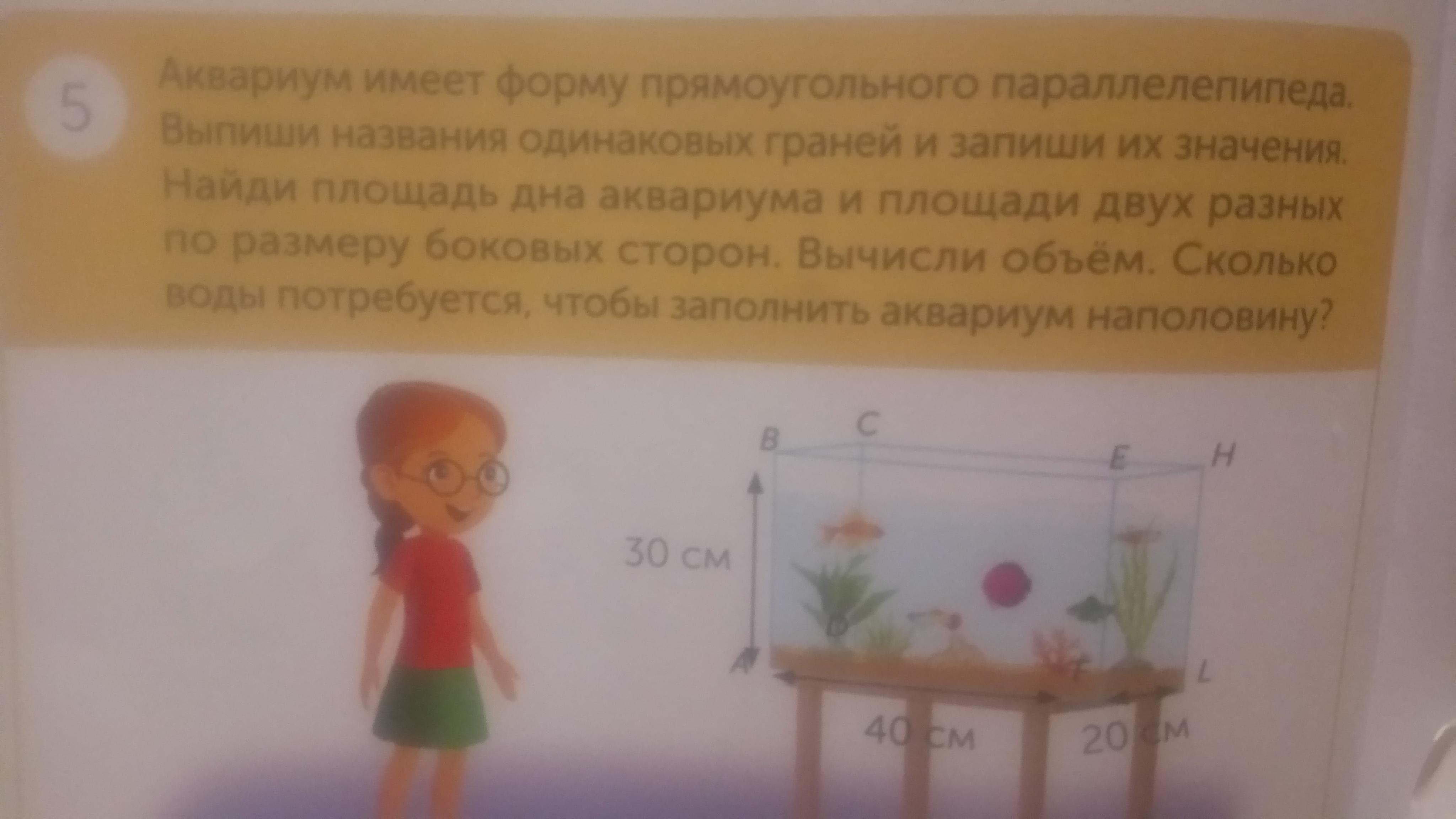 Аквариум имеет форму прямоугольного параллелепипеда.выпиши названия одинаковых граней и запиши их значения.найди площадь дна аквариума и площади двух разных по размеру боковых сторон.вычисли объём.сколько воды потребуется чтобы заполнить аквариум наполовину?