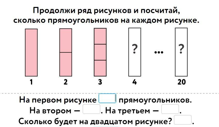 Ответ:в четвёртом будет-4 прямоугольника,а на двадцатом будет-20 прямоугольников.