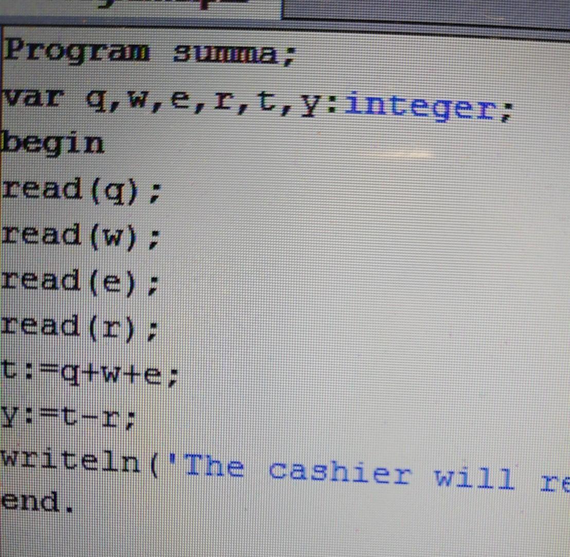 Составить программу: Трое друзей-первоклассников Петя, Ваня и Толя решили подарить своему другу Коле на день рождение настольную игру. Придя в магазин, они достали деньги, которые им дали родители на подарок, и передали их Ване для покупки игры. Ваня подошел к кассе и подал деньги. Написать программу, которая определит, сколько денег кассир должен вернуть Ване.