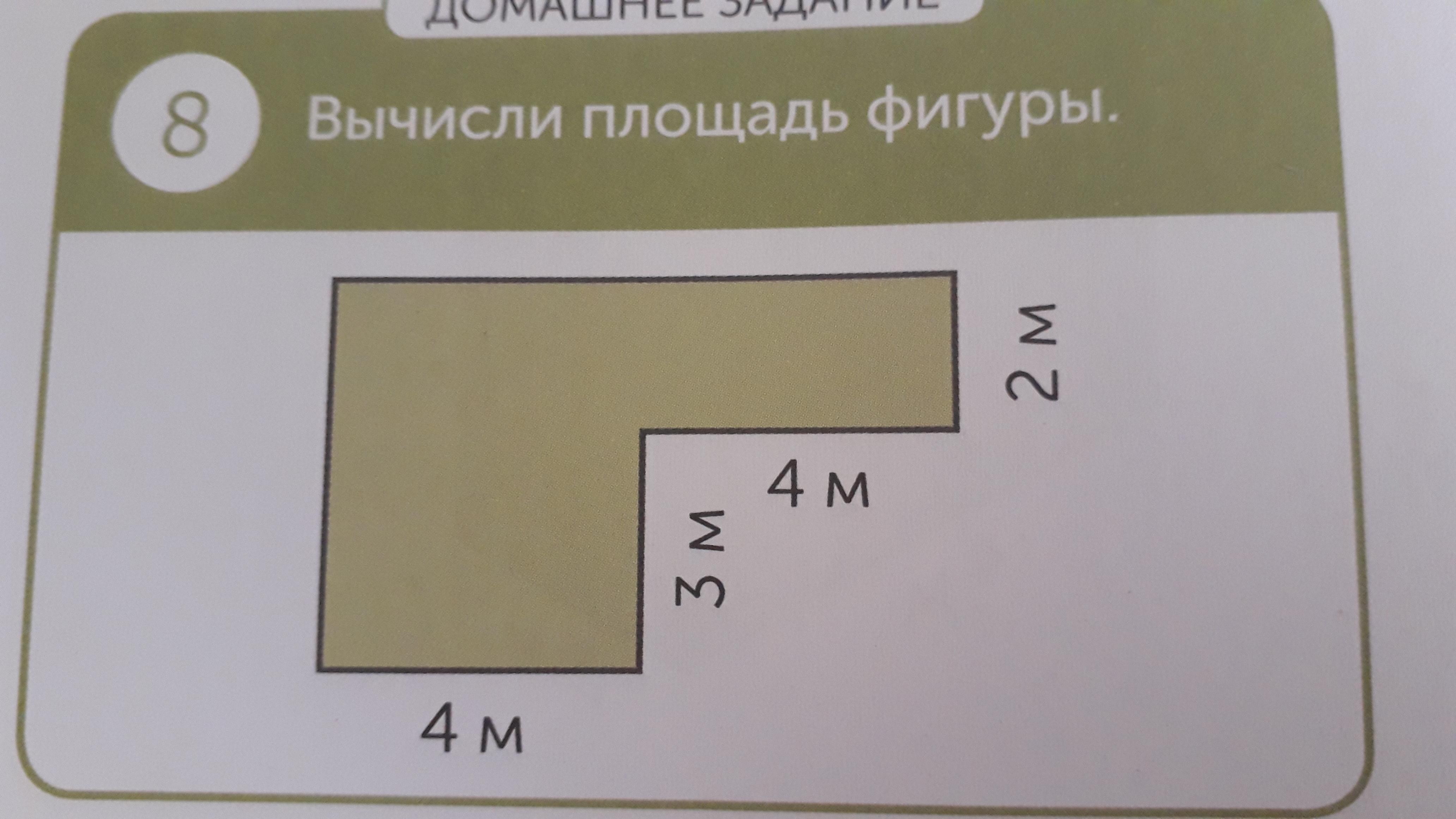 Площадь этой фигуры состоит из площадей двух прямоугольников. Один прямоугольник со сторонами a1=4 м и b1=3 м, а второй прямоугольник со сторонами a2=(4+4)=8 м и b2=2 м. Найдем площади каждого из этих прямоугольников перемножив стороны друг на друга: