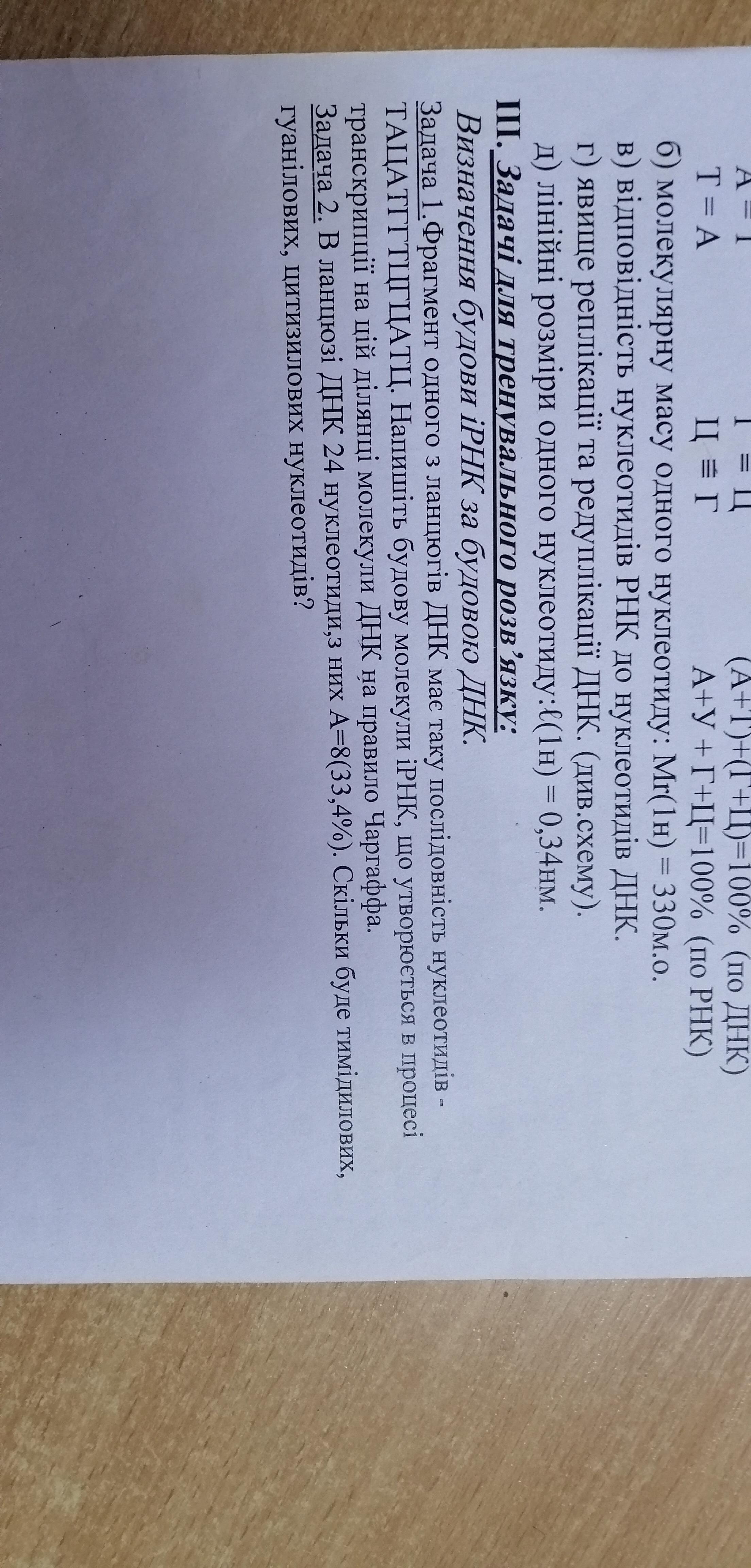 Допоможіть будь-ласка! У ланцюзі ДНК 24 нуклеотиди, з них А = 8 (33,4%). Скільки буде тіміділовіх, гуаніловіх, цітізіловіх нуклеотидів?