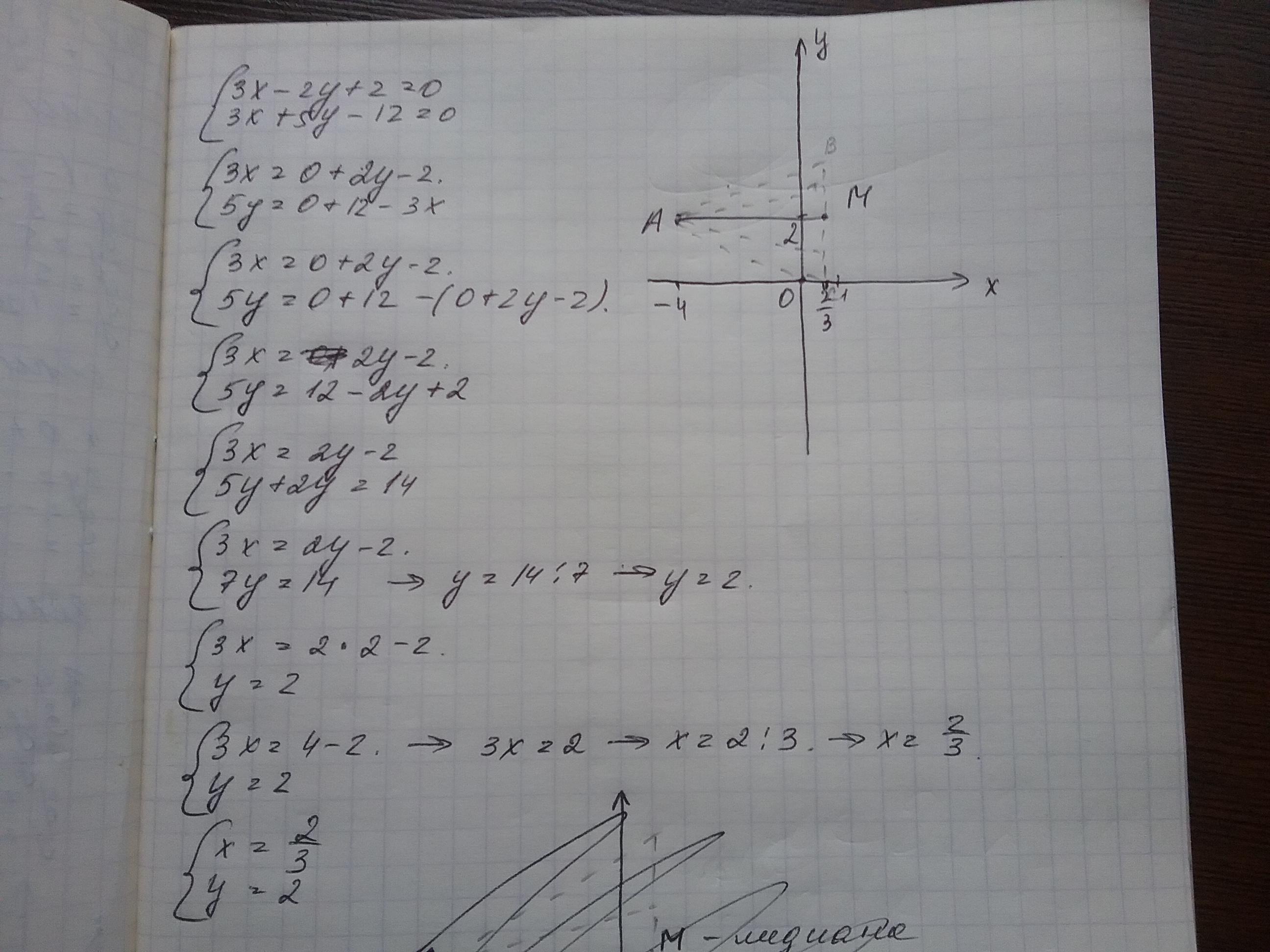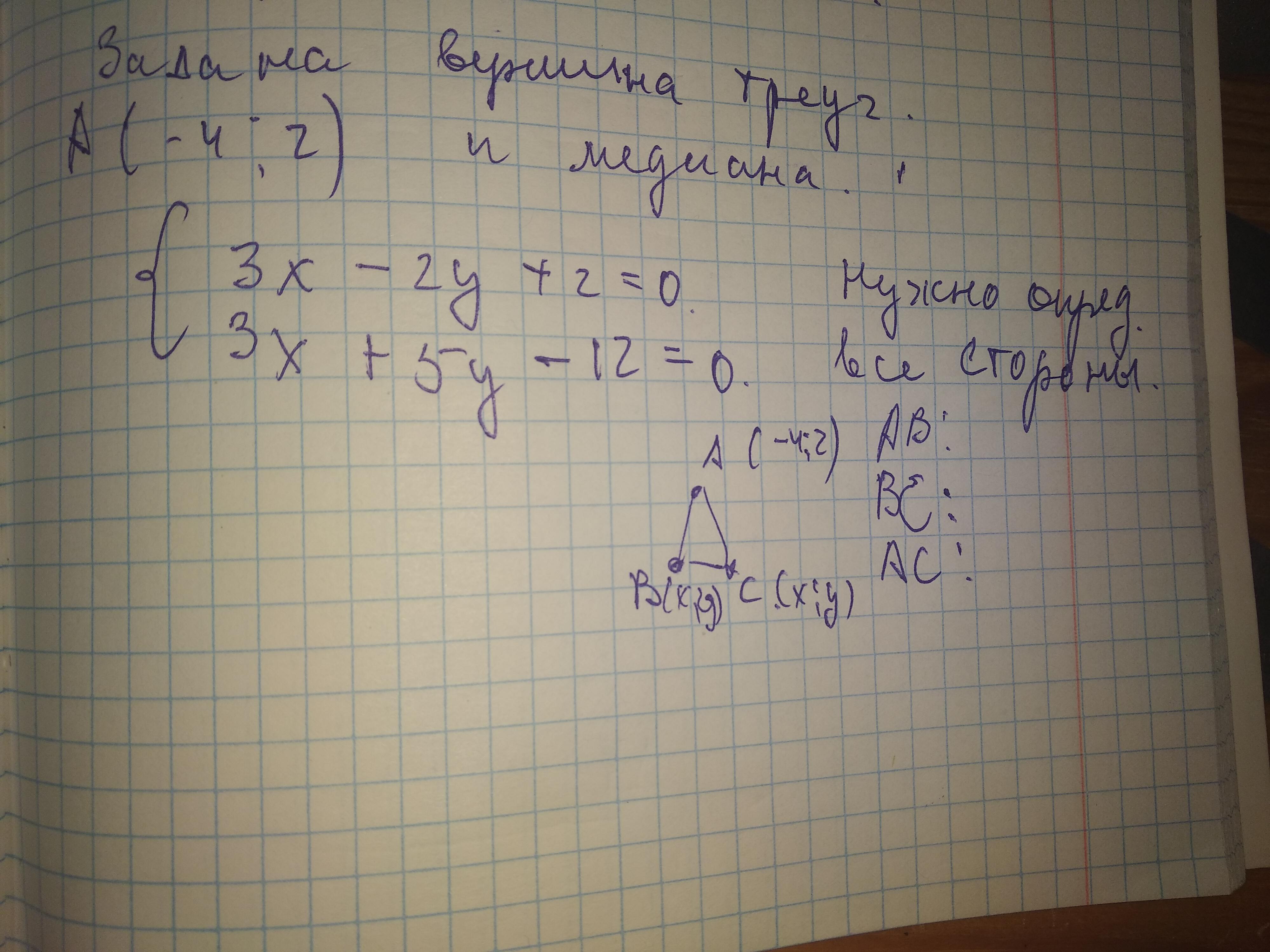 А вот дальше, нужно знать длинну ВС, потому что мы узнаем координаты точки М которую образует медиана. И делит сторонв ВС пополам, из графика мы видим что у точек В,С х=2/3, а вот у будет меняться в зависимости от длинны отрезка ВС или величины угла ВАС, таким образом мы не сможем узнать точные координаты точек В и С и соответсвенно координаты сторон треугольника.