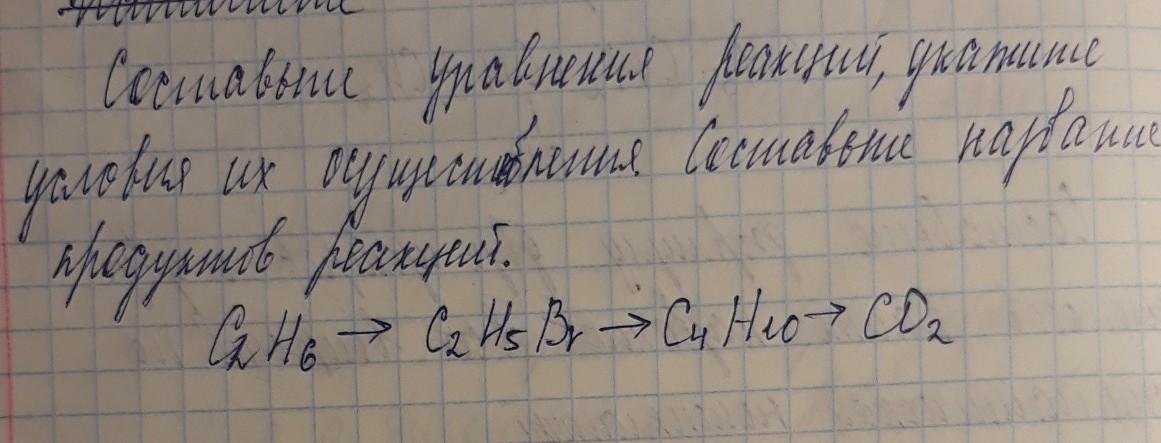 Составьте уравнения реакций укажите условия их осуществления Составьте названия продуктов реакции C2H6-C2H5Br-C4H10-CO2