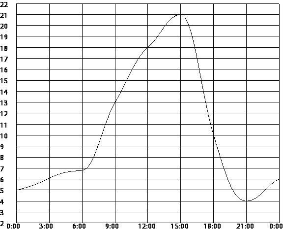 На рисунке показано, как изменялась температура на протяжении одних суток. По горизонтали указано время суток, по вертикали — значение температуры в градусах Цельсия. Сколько часов во второй половине дня температура превышала 10 °C?