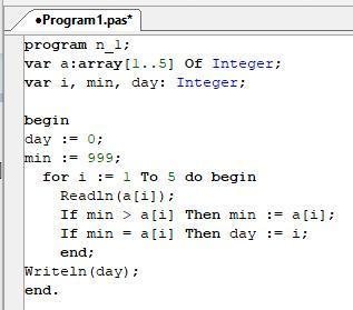 Помогите пожалуйста решить задачу. Язык Паскаль. Вася решил посчитать, в какой день меньше всего уроков, если известно, что они учатся 5 дней.