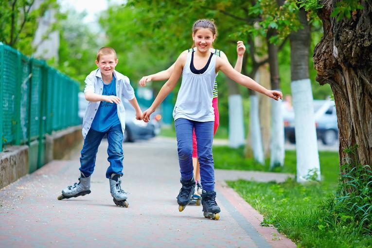 На фото изображены компания друзей , катающиеся на роликовых коньках . слева от них деревья , обмазанные специальным средством, но одно дерево отличается от других . А также возле них зелёная трава и листья от самих деревьев .