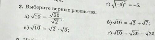 Выберите верные равенства: а) √10=√20/√2; б) √10=√3+√7; в) √10=√2•√5; г) √10=√30-√20.