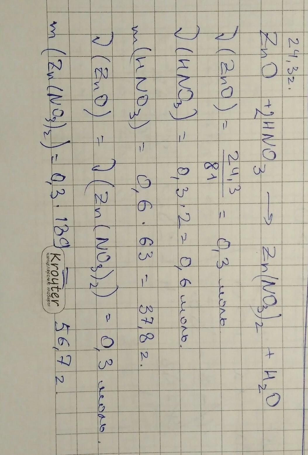 Оксид Zn массой-24,3 г растворили в азотной кислоте (HNO3). Найти массу кислоты. Найти массу полученной соли